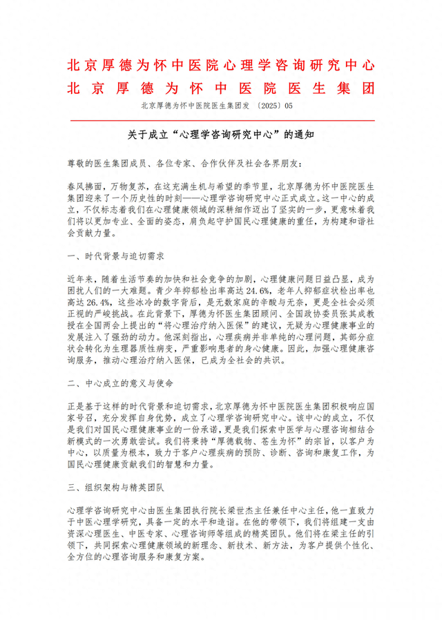 It is precisely based on such a time frame and pressing needs that Beijing Houde Hospital Physician Group actively responded to the national call, fully utilized its advantages, and established a psychological consulting research center. The establishment of the center is not only a commitment to the national mental health cause, but also a bold attempt to explore a new model of combining Chinese medicine with psychological counseling.