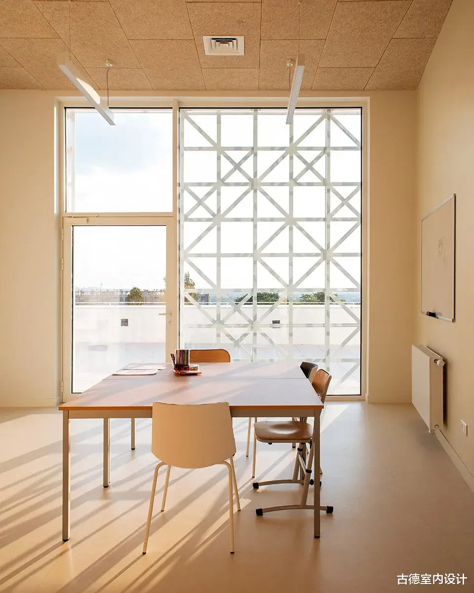 ▲教室©Gaëtan Chevrier立面设计从橘园的优雅建筑中提取的几何形状贯穿了二层和三层。这一几何图案的变化创造了一个联系,成为一种信号。这座单体白色混凝土建筑不仅通过体块的变换得以增强韵律,还通过图案在其表面的滑动效果增加了层次感。部分作为外墙覆盖,部分作为遮阳装置,这种外立面装饰在不同的光照下赋予了立面深度,随着时光流转,立面表现出不同的景象与反射。