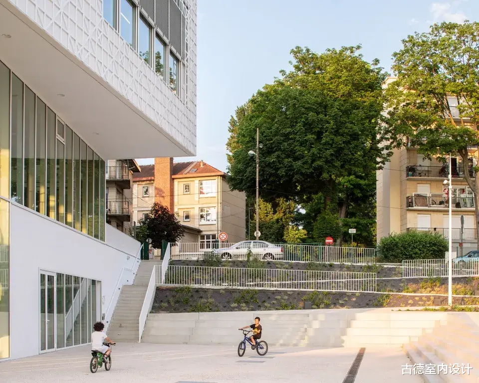 ▲成为真正的文化枢纽©Gaëtan Chevrier克利希-苏布瓦的上城与下城交汇处新音乐学院位于克利希-苏布瓦上下城区的交汇点,是一座真正的十字路口:建筑坐落于草坪和18世纪的橘园之间,沿着悬挂的费尔南·林代大道。第一层遵循大道的轴线,而上层与橘园对齐,创造出一种视野效果,并且有一个外部公共楼梯通往下方的广场。设计的挑战在于如何将建筑物在这两个平面之间进行协调。通过连接上层和下层的方式,建筑形成了动感的韵律。音乐学院的基座与其周围的区域紧密相连,呈现出人性化的尺度。它拔地而起,标志着这座城市的新印记,深深扎根于其所在地。