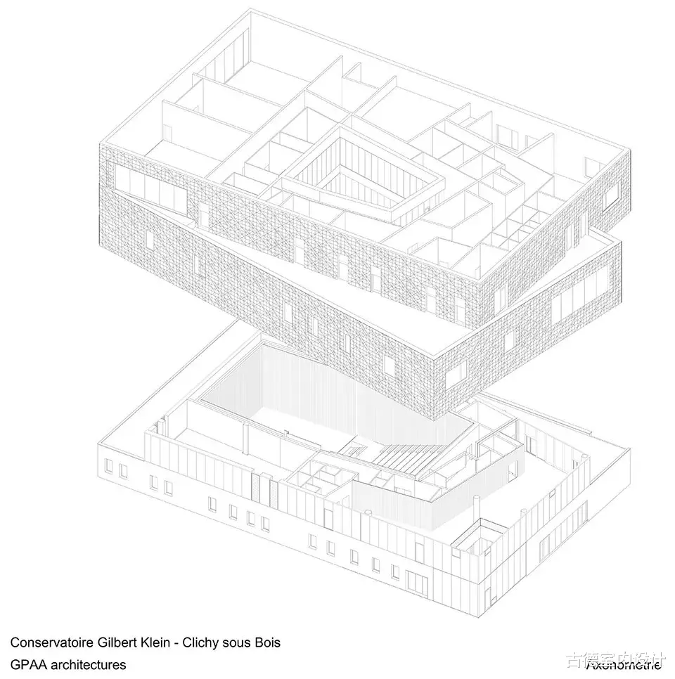 ▲建筑形态©Gaëtan Chevrier功能布局新建的吉尔贝尔·克莱因音乐学院,作为当地社区的一部分,涵盖了四大艺术学科:音乐艺术、表演艺术、舞蹈艺术以及塑料与数字艺术。项目的核心是音乐厅,它巧妙地融入了空间中。从底层直接进入,舞台位于第一层,而阶梯座位则巧妙地融入建筑形式,通往大厅。