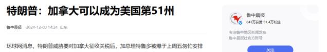 信息来源:2024年12月3日发表于鲁中晨报——《特朗普:加拿大可以成为美国第51州》