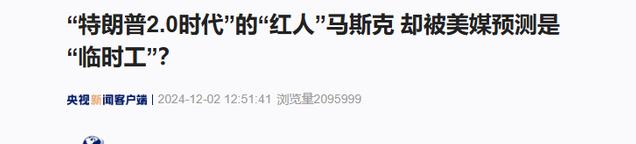 信息来源:2024年12月2日发表于央视新闻客户端——《“特朗普2.0时代”的“红人”马斯克 却被美媒预测是“临时工”?》