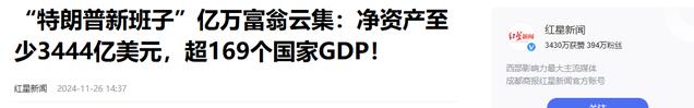 信息来源:2024年11月26日发表于红星新闻——《“特朗普新班子”亿万富翁云集:净资产至少3444亿美元,超169个国家GDP!》