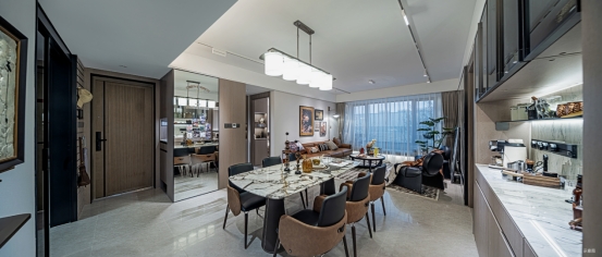 其中,建面约101㎡百变三居,作为当红爆款产品,精研客群对于舒居的需求,通过科学的动线规划及空间布局,在有限的空间内,实现自由创变,带来生活的百变可能;餐客双厅联通阔绰飘窗,延伸空间尺度,盛放亲友欢聚时刻,更将自然美景引入室内,为居家生活增添一丝诗意,令家更为舒适宜居。