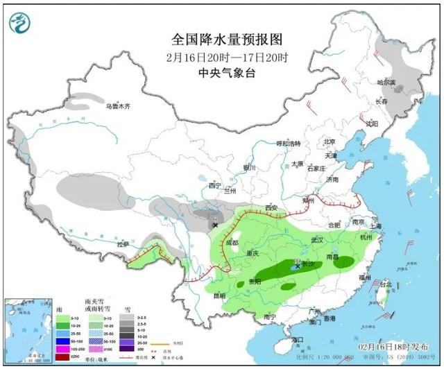 2月16日20时至17日20时,东北地区中北部、新疆伊犁河谷和西南部山区、西藏东部和西南部、青海南部、甘肃南部、川西高原北部等地部分地区有小到中雪或雨夹雪,局地有大雪(5~9毫米)。西藏东南部、西北地区东南部、江汉大部、江南大部、西南地区东部和南部、华南西部等地部分地区有小到中雨,局地有大雨(25~30毫米)。
