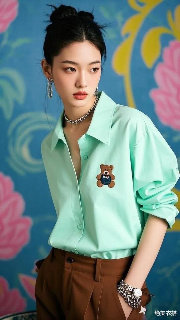 如果想更加契合,点缀在鲜薄荷绿衬衫中的小小泰迪熊,凭一己之力,衔接出棕绿配的惊喜。加点可爱,来点酷感,模糊年龄,好高明哇。