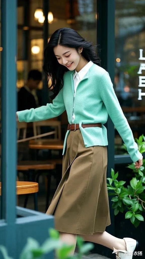 鲜薄荷绿衬衫+棕色半裙,好一对明快的配色穿搭啊。进退有序间,好似绝不融合的两场大戏,平稳地进行着......