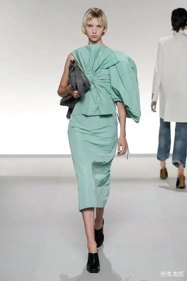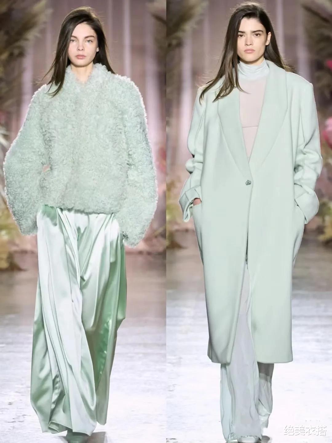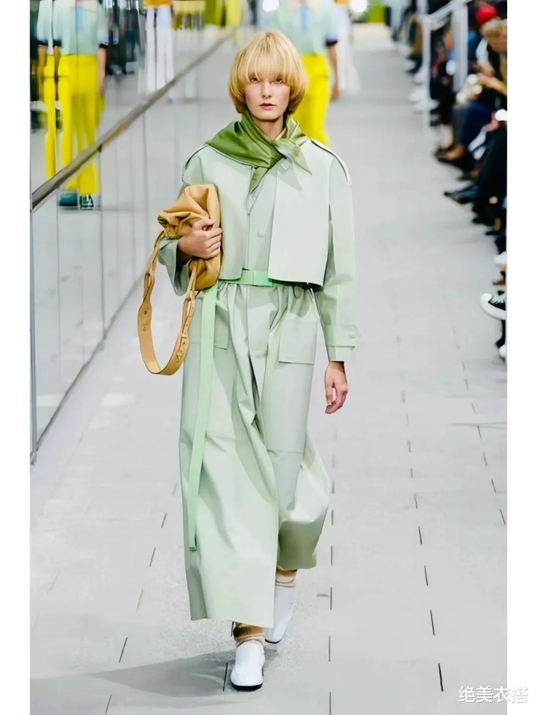 这套T台穿搭,鲜薄荷绿为主,辅佐以暖感色调,比如黄绿、米色、白色,对比清晰,仍不失温柔这盘大棋。