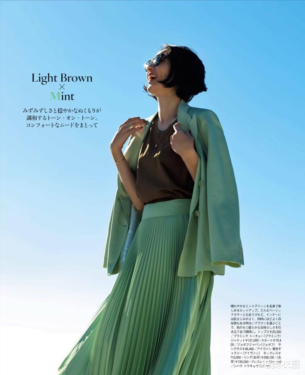 优雅淑女,大可在鲜薄荷绿+棕色里,找到属于自己的时尚进行曲。常见单品,也能因个性腰带系法而趣味妙生。