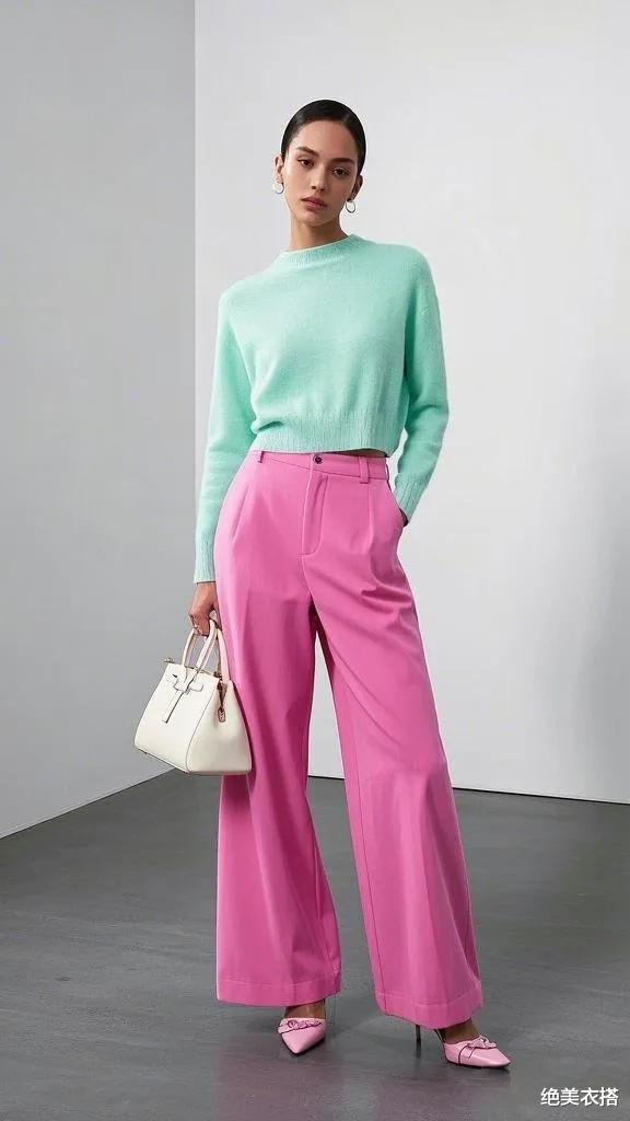 绿毛衣+粉紫阔腿裤,以从不失败的形态再次将鲜薄荷绿配粉色的鲜活,刻画入微。简洁大气,精致有型,任何女人都可一试。