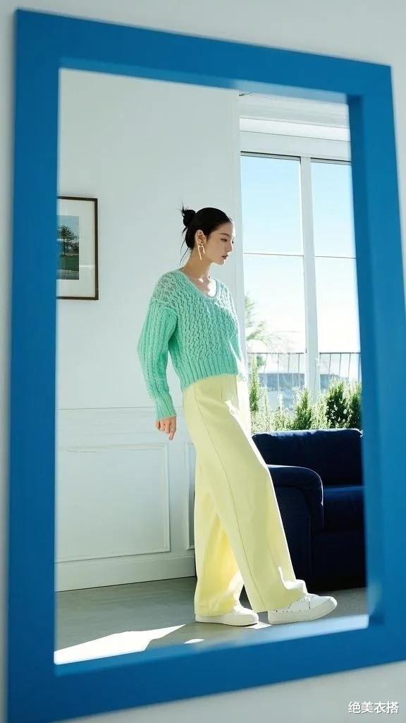 鲜薄荷绿毛衣+明黄色阔腿裤,撞色大胆,但又不失该有的分寸,风格轻松,写满自由自在。一双小白鞋,就是它们最松弛的衔接。
