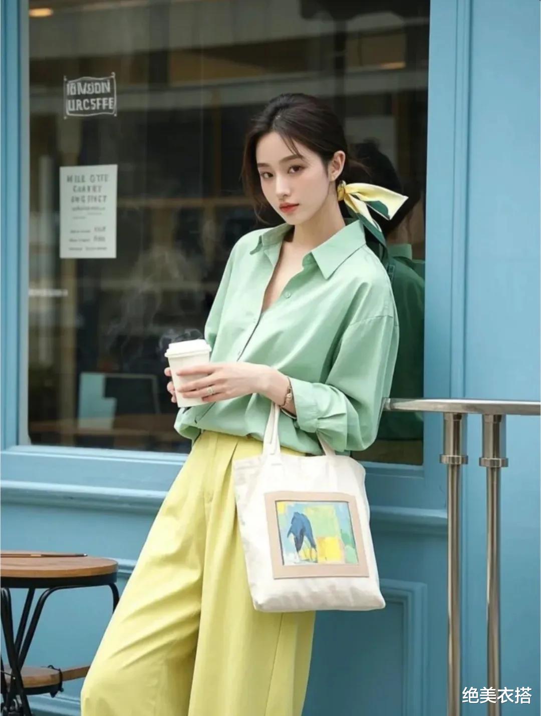鲜薄荷绿衬衫+明黄色阔腿裤,单品风格一转,有着毛衣所不及的帅美与洒落。可甜、可盐,绿黄配的精彩,也有百变的一杯羹。