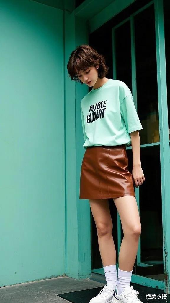 对了,还有鲜薄荷绿T恤+棕色皮裙,又是夏日街头稳妥的时尚素材。鲜活与沉稳碰撞,总能带来意犹未尽的盎然,