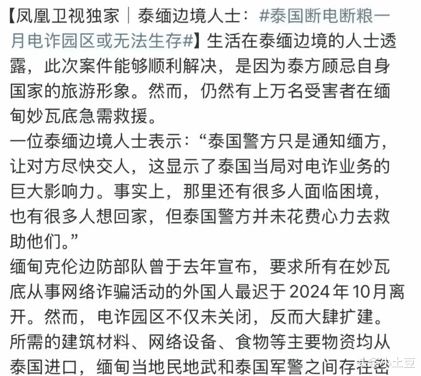 只要泰国给缅甸诈骗园区断供,就无法支撑下去,这觉得不太现实。要把园区连根拔掉,还是要用雷霆手段。