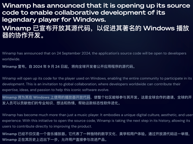 2024 年 5 月,Winamp 团队发布了“开源预告”,称将于 9 月 24 日提供其 Windows 版本的源代码,并邀请全球开发者参与贡献 —— 为 Windows 用户打造完美播放器。