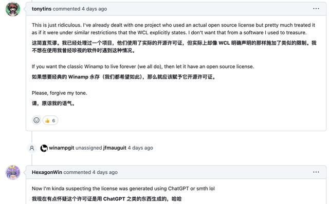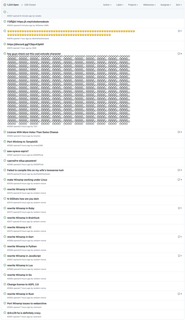 而为了表达不满的情绪,全球开发者纷纷涌进了 Winamp 的 GitHub 仓库,在其 issue 下面疯狂整活:各种无意义内容的刷屏、阴阳怪气发言,等等——仿佛进了贴吧。