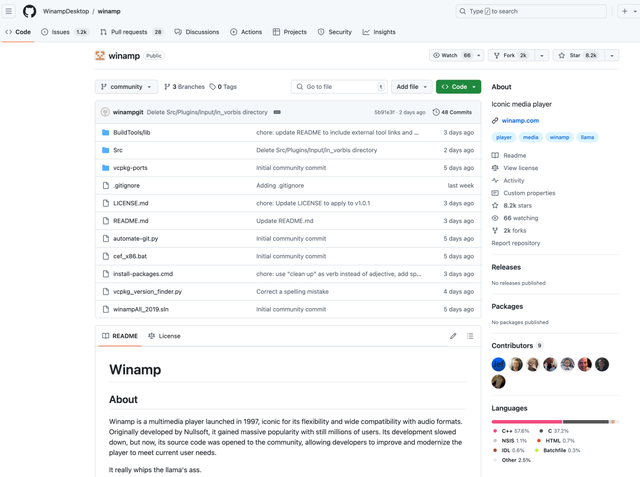 Winamp 播放器兑现了今年 5 月份的承诺,于 2024 年 9 月 24 日正式在 GitHub 上发布了其 Windows 端的源代码,允许开发者改进和更新播放器以满足当前用户的需求。“Winamp 将开放 Windows 版本播放器的代码,让整个社区都能参与其开发......Winamp 已不仅仅是一个音乐播放器。它体现了独特的数字文化、美学和用户体验。