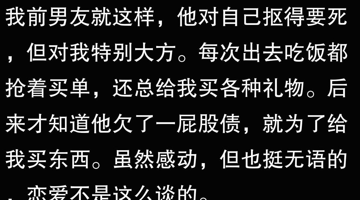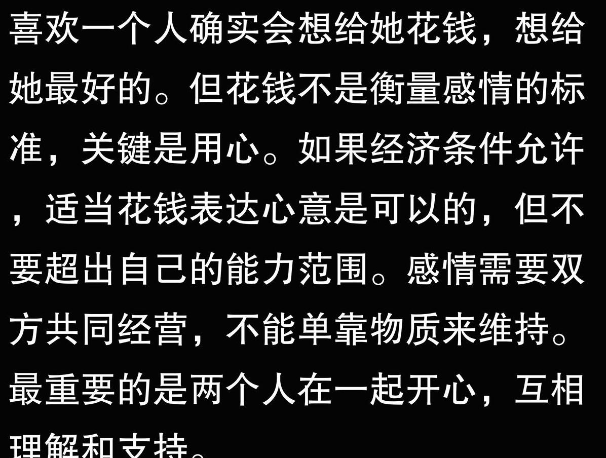 有些人认为,只要经济允许,为对方花钱是理所当然的;另一些人则觉得,两个人在一起,更多依靠的是心理的契合和共同的目标,而不是物质。