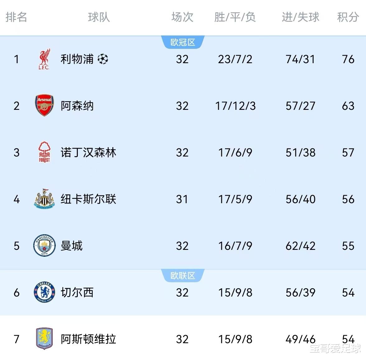 上赛季英超第4名阿斯顿维拉是68分,第5名热刺取得了66分,本赛季英超第5名的门槛差不多也在66分左右。从各队目前积分状态以及剩余赛程来看,最有希望进入英超前5名的球队,除了利物浦和阿森纳以外,应该是诺丁汉森林、纽卡斯尔和曼城。