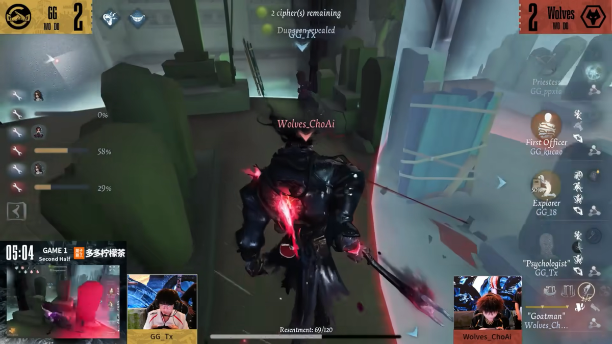 在小组赛最后一场的比赛中,两支老牌强队“成都夫妇”强强对决,最终,成都Wolves技高一筹,获得了本场比赛的胜利。成都Wolves双阵营状态近期一直欣欣向荣,尤其监管者ChoAi的角色池与近期游戏版本相应,使他的发挥更加如鱼得水。求生者一如既往地敢打敢拼,队伍的选手人如其名,靠着奋起拼搏的狼性拿下了一场又一场的胜利。成都GG战队又是另一种风格的队伍,他们更擅长的是稳中求胜,慢慢蚕食对手使其败于马下。