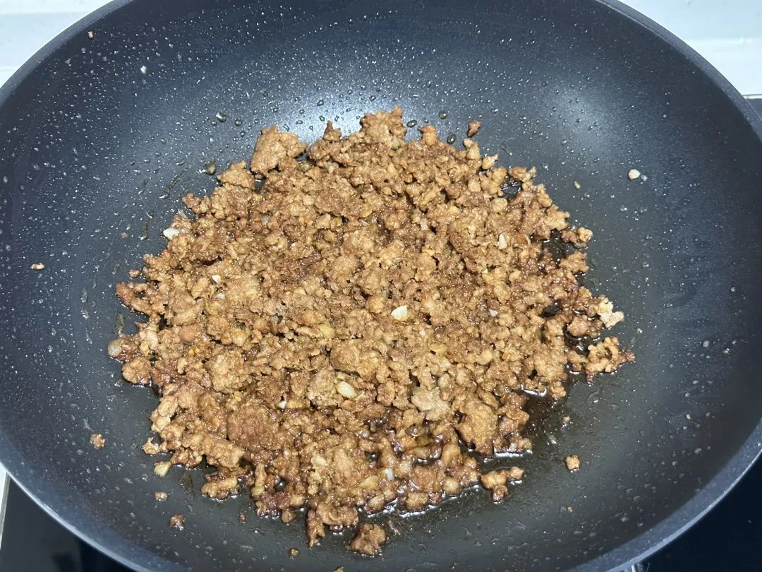 2、热锅凉油,加入肉末翻炒至变色,加入生抽2勺 老抽1勺 海盐1勺 大蒜2个 白胡椒粉 姜粉适量翻炒均匀至上色;