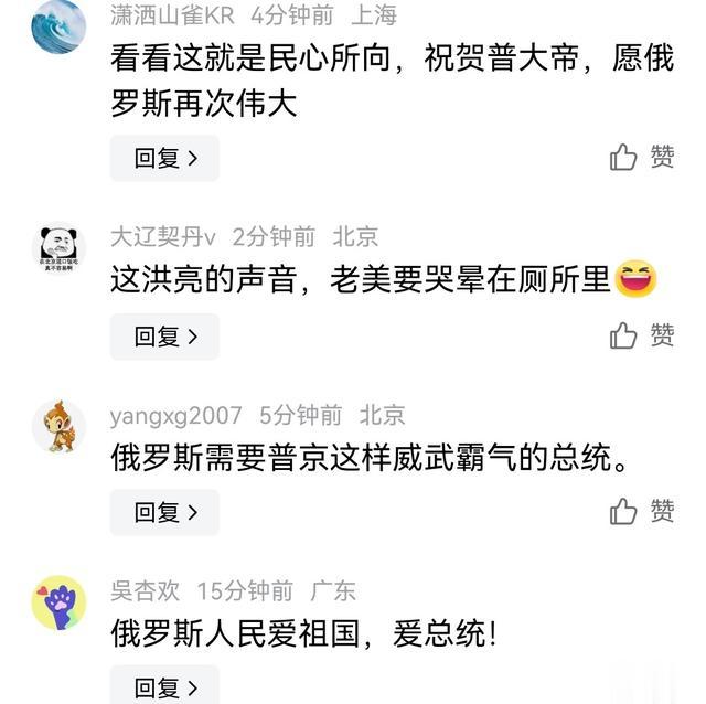 又有的网友说看这民心所向,老美估计要哭晕在厕所里!普京的大嗓门跟特朗普有的一拼!这二位如果能站在一块的话,确实能够不分伯仲!