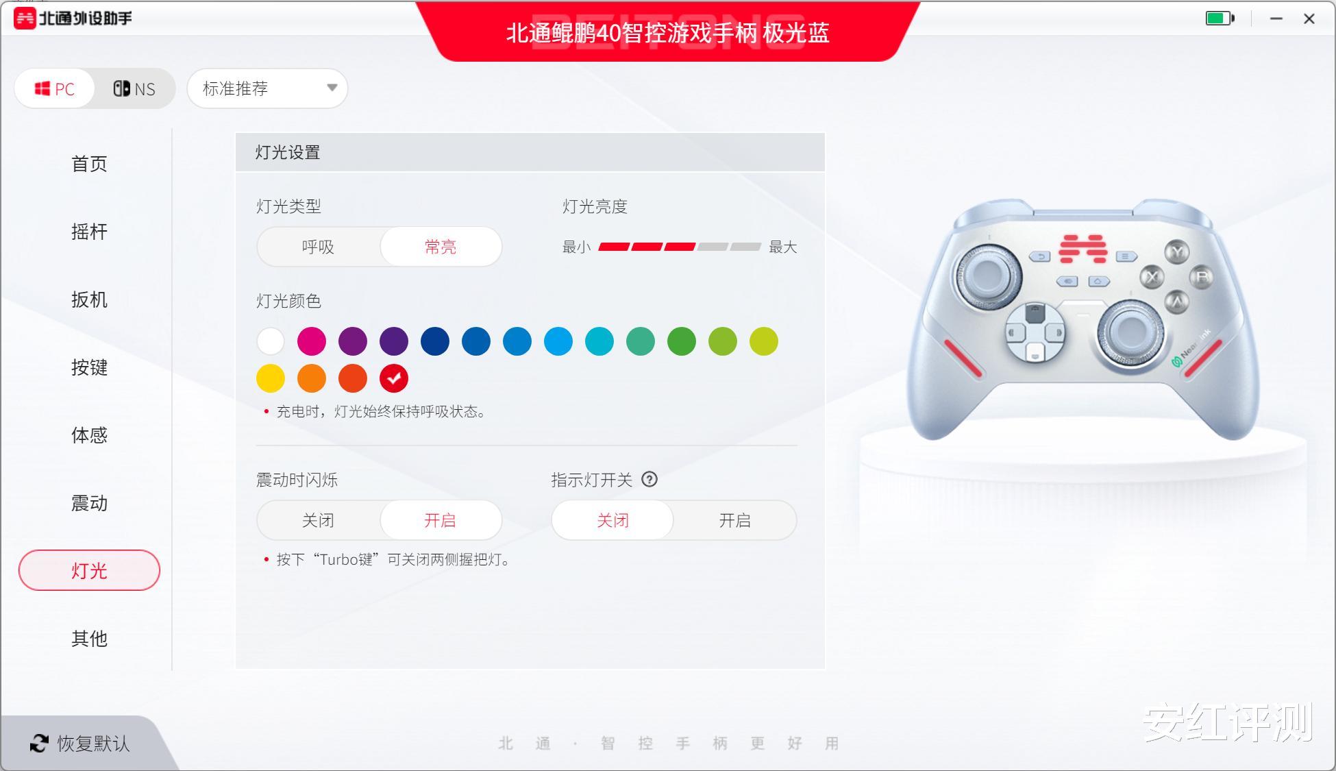 让我意外的是,此款手柄具有多彩灯效,可以使用外设助手设置灯光颜色,灯光类型和灯光亮度等。logo和侧翼灯带亮起的瞬间,瞬间提升电竞氛围感,游戏更加燃情!