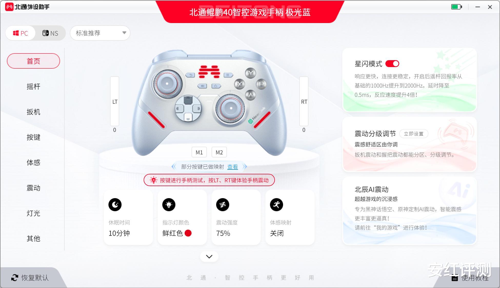 此款手柄支持北通游戏厅应用,它能够自定义按键、摇杆、扳机、震动和灯光等,可以修改按键映射、调节摇杆死区和震动强度等,这样按照自己习惯进行设置,游戏起来如虎添翼。