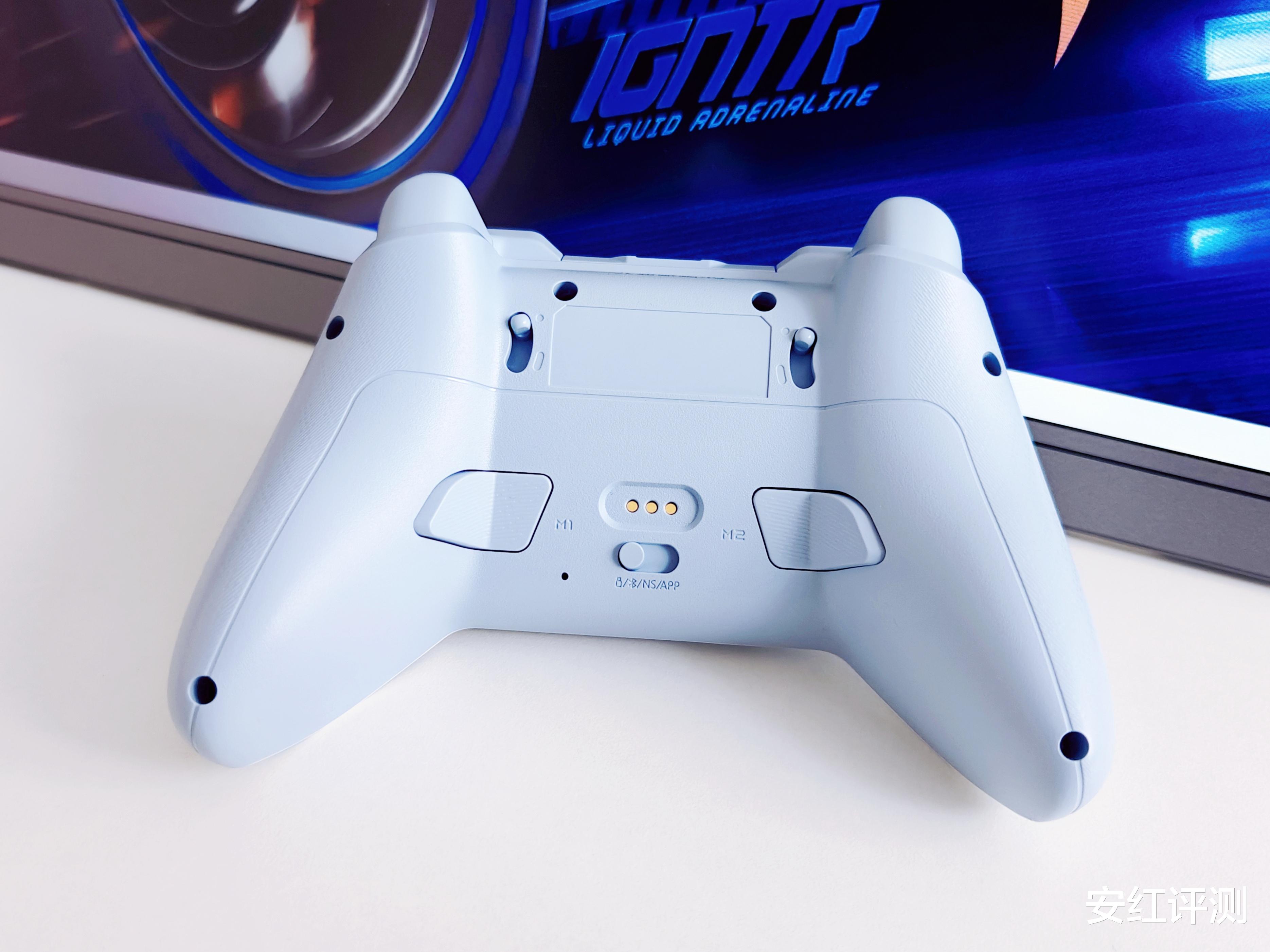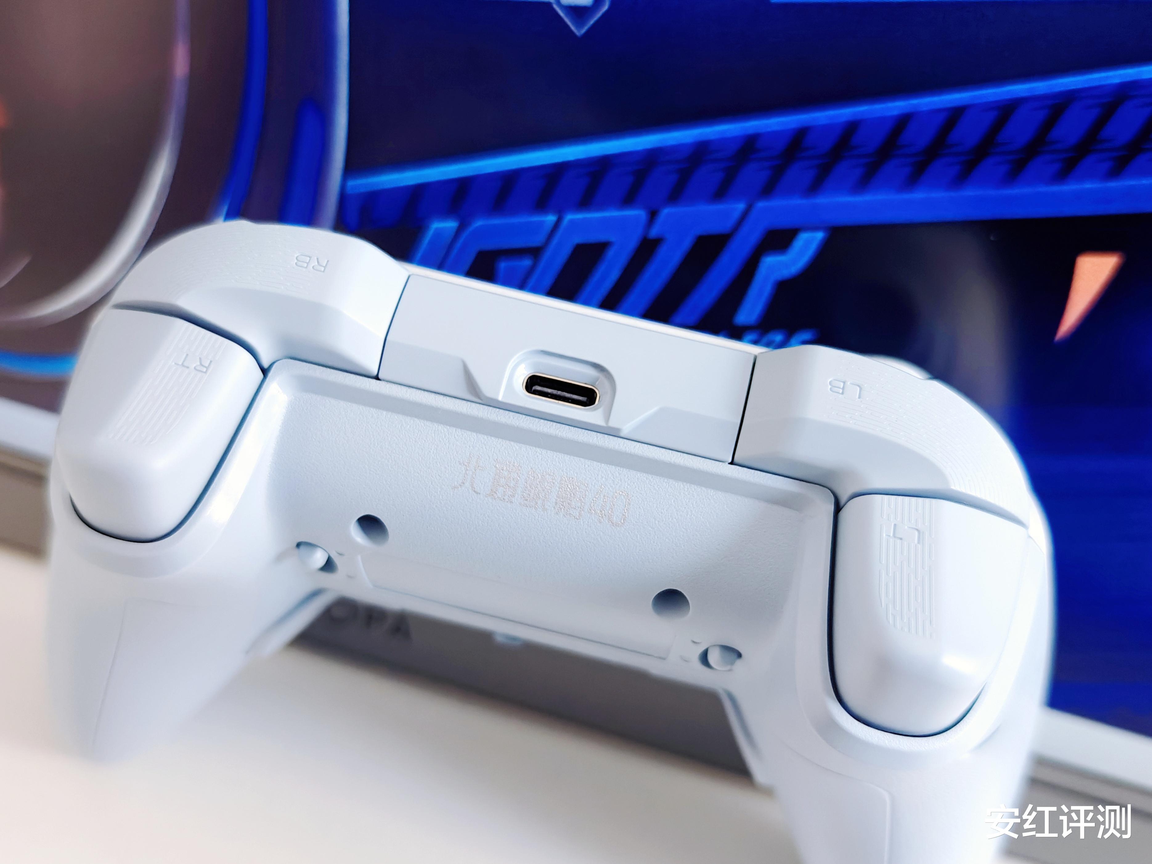 手柄上部有四个肩键,两横两纵,弧形相贯,表面同样晒纹,指部接触舒适不滑,外形符合人体工学。肩键中的LT和RT采用了TMR双切扳机设计,通过两段式扳机锁,可以实现线性与微动一键切换,长短行程随心所欲。同时还设有Type-C接口,可以有线连接设备或者给手柄充电。