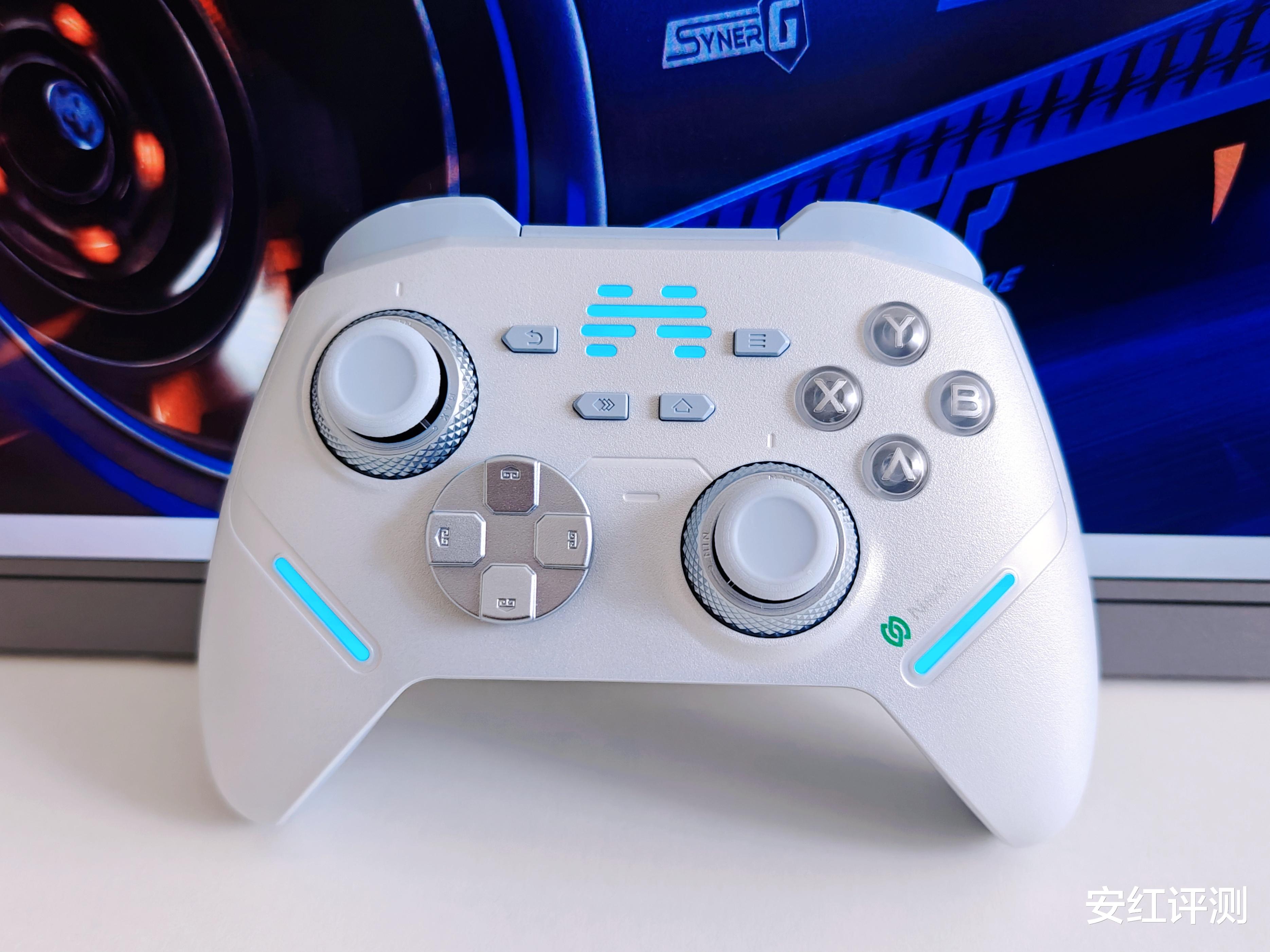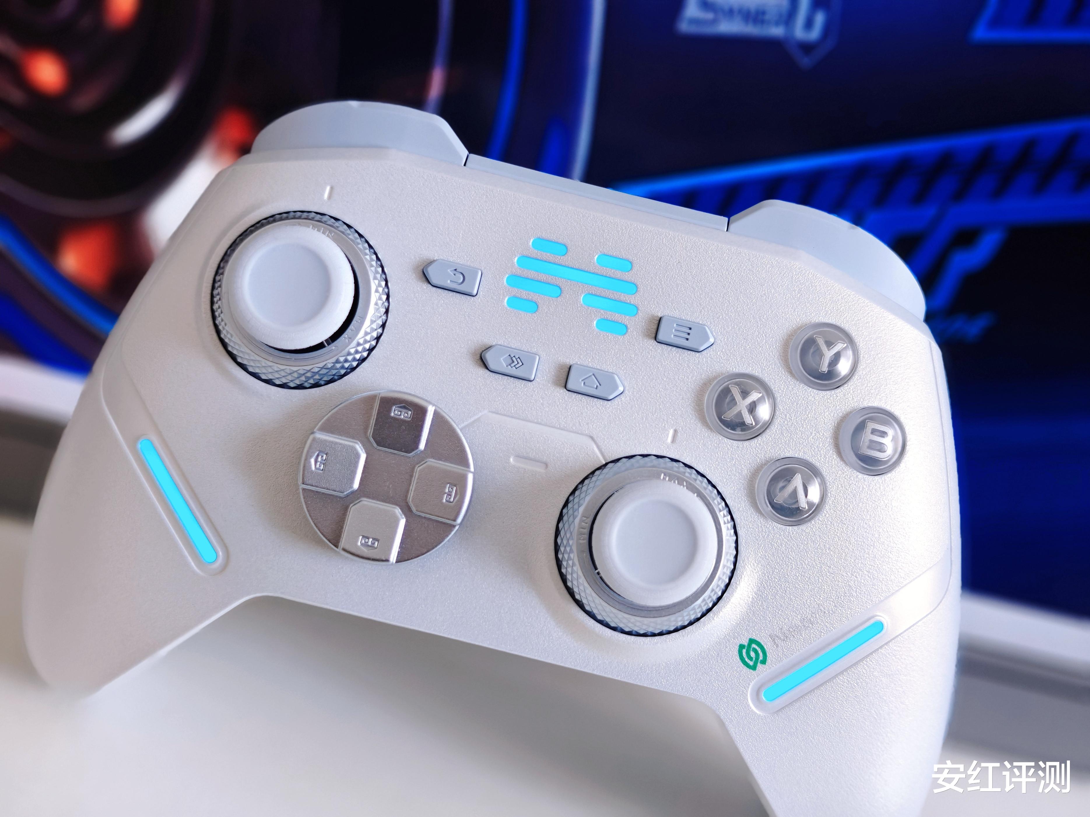 此款手柄采用极光蓝配色,炫影镭射工艺涂装,整体散发出星河般光芒,不仅好看拉风,而且耐磨耐脏,防滑防汗,久用不包浆,光彩依旧。外形尺寸上为常规手柄,成年人可以轻松握持。此款手柄采用了经典手柄布局,拥有ABXY光轴按键、TMR可调阻尼双摇杆和全向十字键,并配有logo和侧翼装饰灯带。值得一提的是按键采用了水晶透明设计,阻尼环和十字键也呈现出金属光泽,时尚富有科技感。