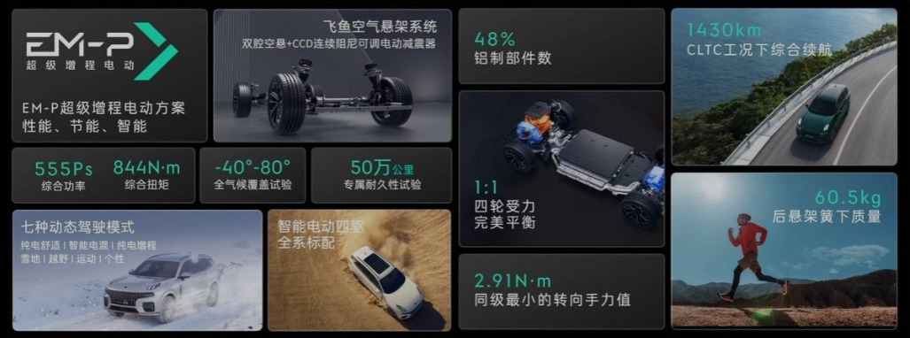 除了出色的安全性,新领克09 EM-P还有强大的动力,搭载领克的超级增程方案,由2.0T发动机和三电机构成动力系统,同时配备三挡混动专用变速箱,以及宁德时代的三元锂电池包,最高纯电续航能达到190公里。