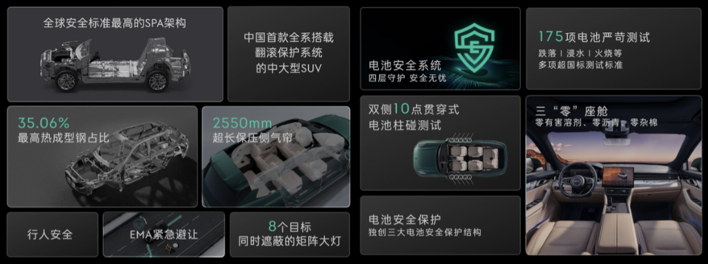 新领克09 EM-P作为领克的旗舰车型,最大的亮点在于安全性能的表现。这款车基于SPA平台为基础,车身结构中的热成型钢占比高达35.1%,这是一种高强度的钢材,使得车身的抗冲击能力得到了极大提升。
