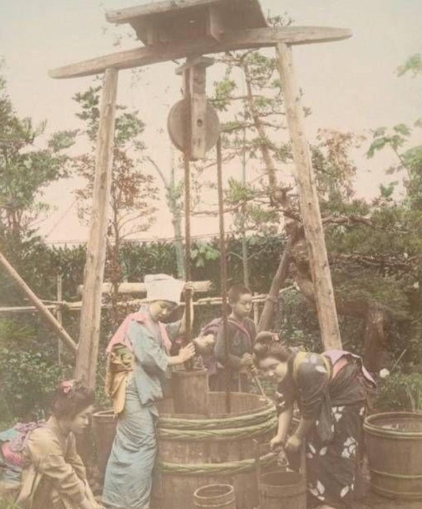 日本人的饮水方式也引起了我的兴趣。他们需要通过井水来获取饮用水,然后用人工方式将水运输到需要的地方。我不禁好奇,穿着和服踩着木屐的日本女性,行动起来真的方便吗?