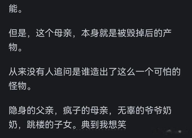 以前我恨我妈,现在我认为我爸全责。孩子能被母亲毁掉,绝大多数的原因都是父亲不作为。不管他是彻底抛弃了这对母子,还是为了自己婚内舒服图耳根清净希望儿女的存在可以替自己转移注意力而对妻子妥协,都是因为他不想管!父亲越是不管,母亲就越是疯狂,最后大家一起越过越差劲。