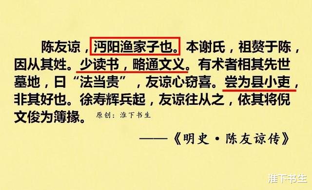 《明实录》是这样描写陈友谅的:“友谅者,沔阳玉沙县人,世业渔。”也就是说陈友谅家,祖上世代以捕鱼为业。但你要注意,祖上捕鱼为业并不代表陈友谅也以捕鱼为业。
