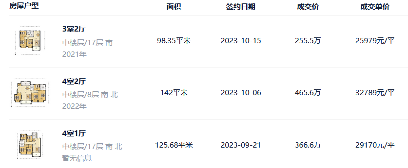 在二手房成交价上,引用贝系数据,最近的几套成交在9月和10月,其中小高层根据户型不同,单价2.6到2.9万,洋房3.3万,在当前市场下,表现还是不错的。