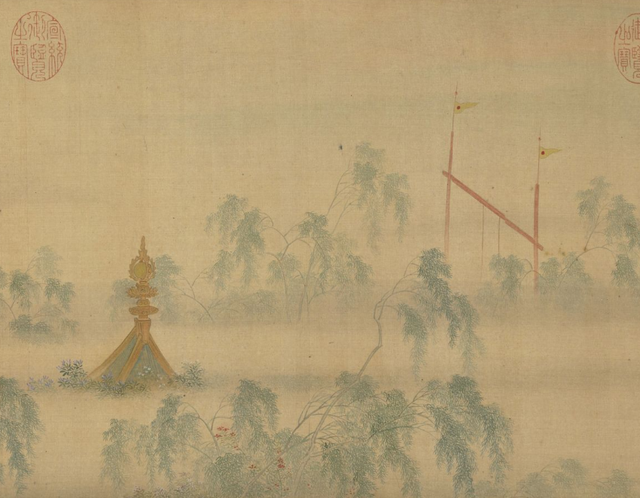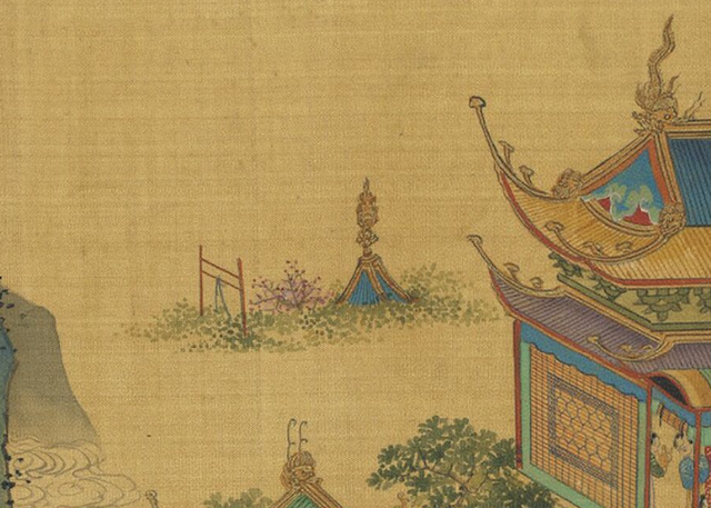 其间显露出的立架和攒尖顶同样如此只露出上半截,若隐若现,据其造型推断很可能是秋千和亭子。在明代吴彬的《岁华纪胜图》中,我们就能看到类似的四方攒尖顶凉亭和秋千顶架,仇英的《清明上河图》中,亦有类似设计。