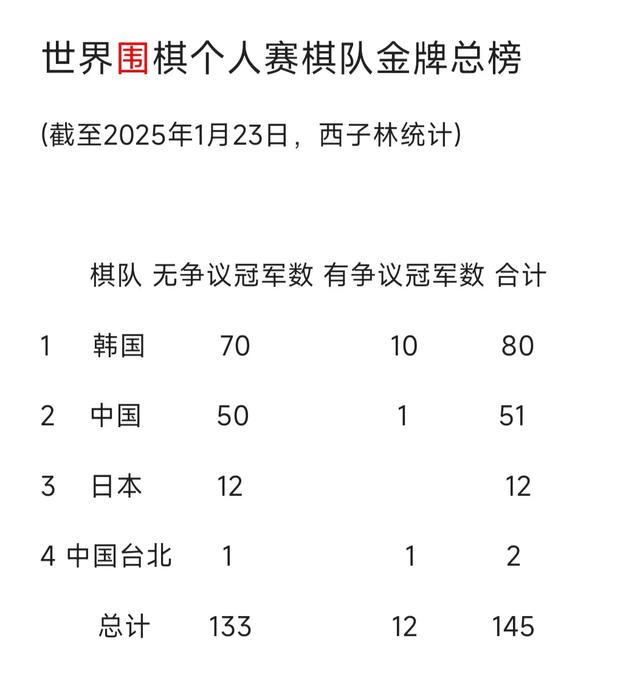 世界无争议棋战(个人赛)冠军目前是133个,加上相对有争议的12个,总数达到145个。
