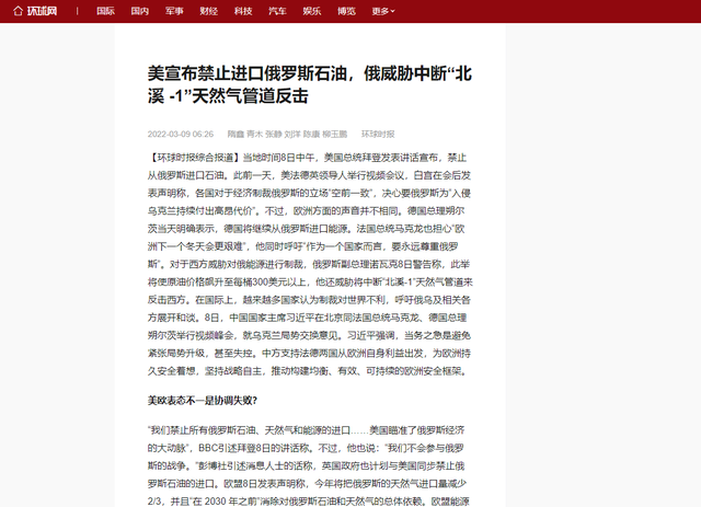 1.美宣布禁止进口俄罗斯石油,俄威胁中断“北溪 -1”天然气管道反击--环球时报
