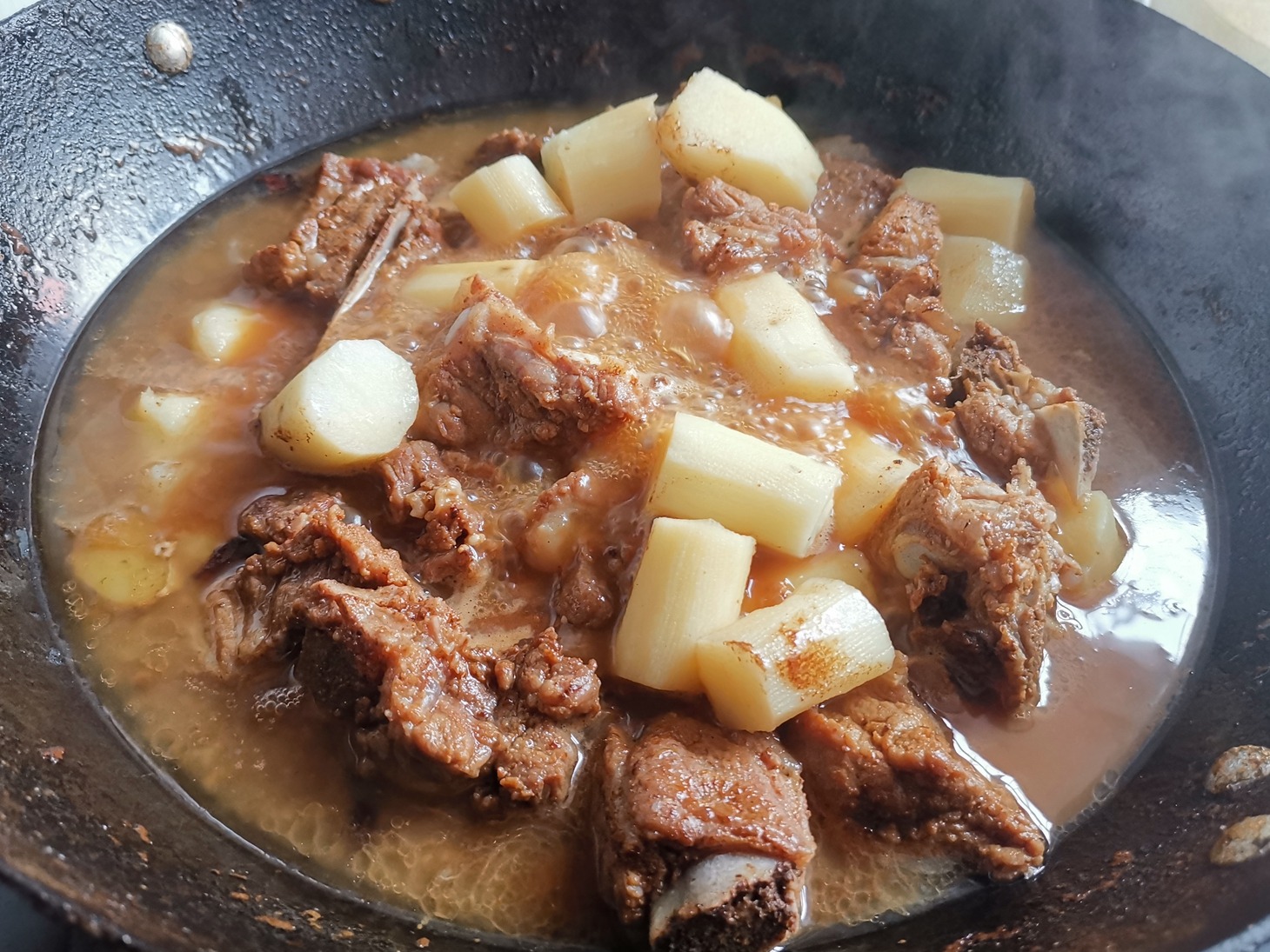 第五步:继续炖大约15分钟,山药也已经充分熟透,汤汁已经变少,就可以关火出锅了。