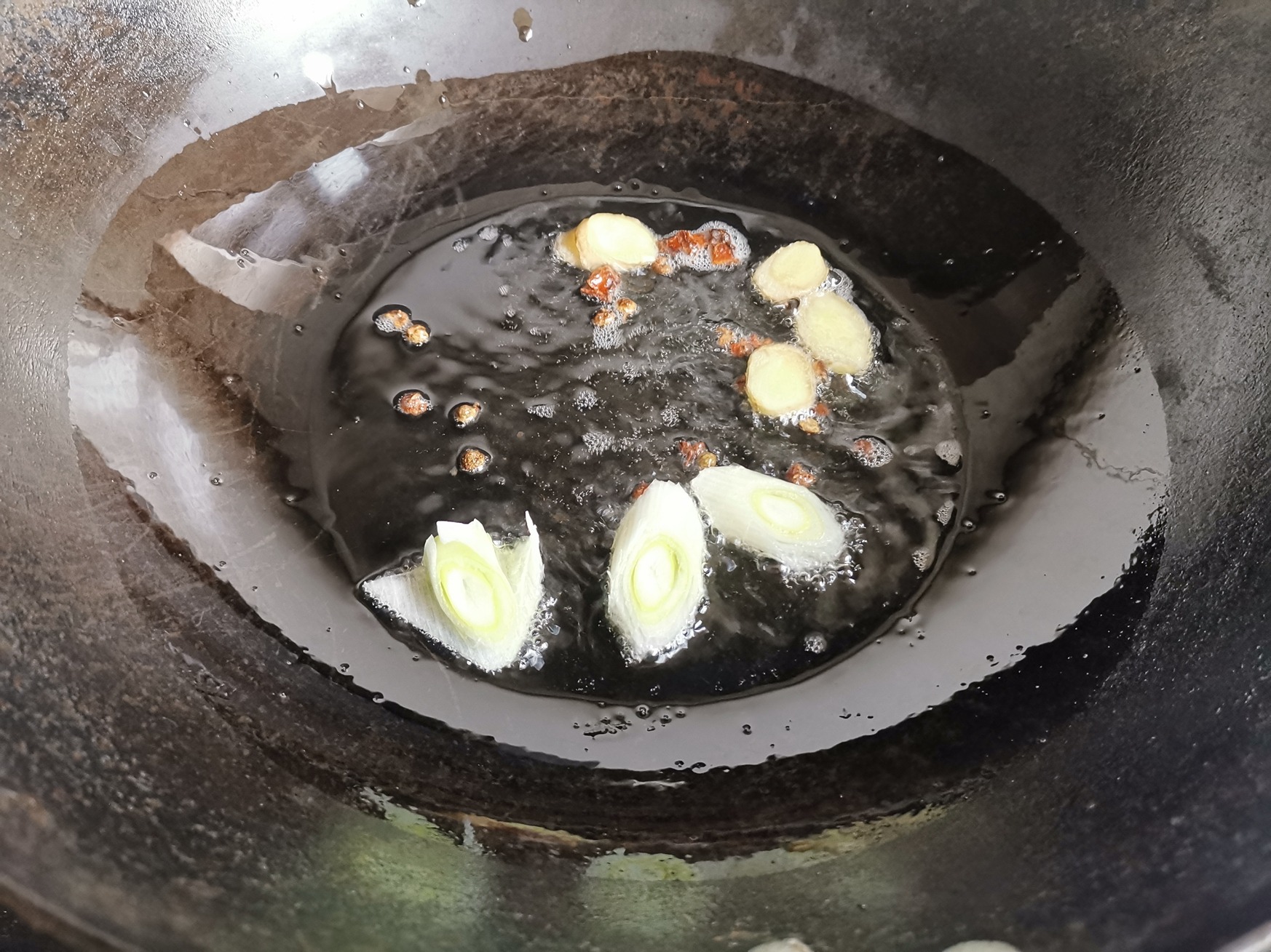 第二步:另起锅,放入适量的花生油,放入葱段、姜片、花椒、大料爆出香味。