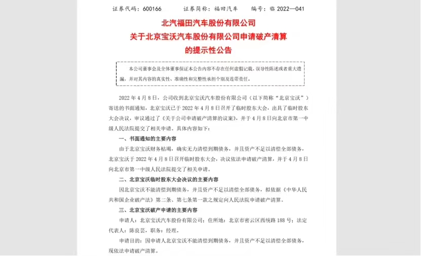 车见万宜讯—近日,福田汽车对外发布公告称,由于北京宝沃汽车股份有限公司财务枯竭,无力清偿到期债务,并且资产不足以清偿全部债务。