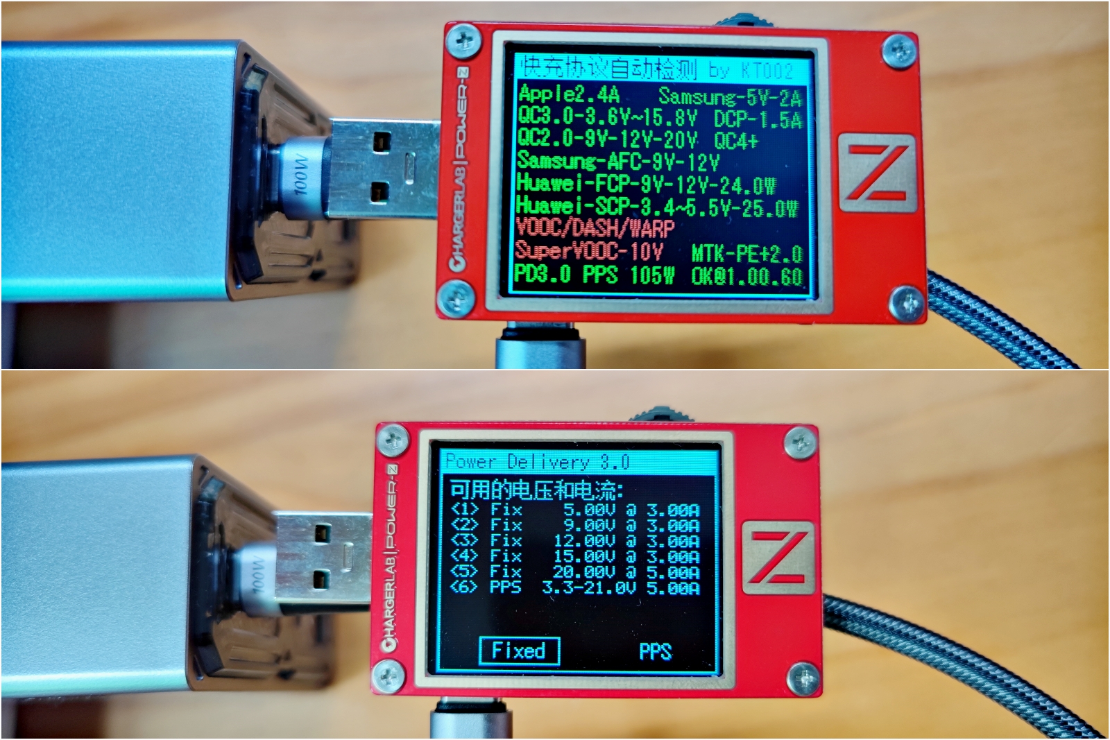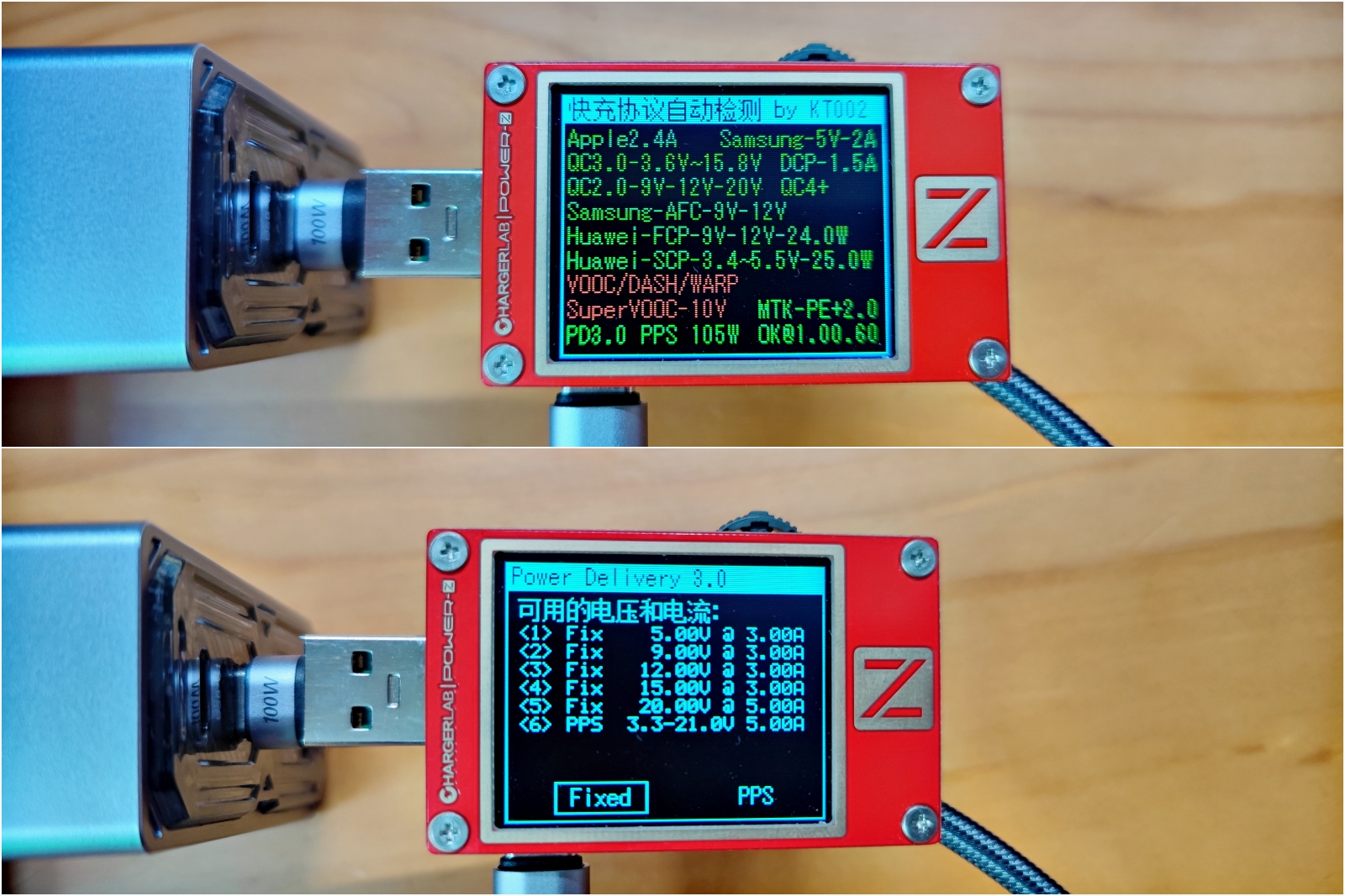 通过工具测试 C2 接口的快充协议,和 C1 是一模一样的,支持多种快充协议并且兼容不同品牌的设备。支持苹果、三星、华为手机的快充协议,并且支持 QC2.0\QC3.0\PD3.0 快充协议(图中绿色表示支持,红色表示不支持)。检测 PD 报文协议分别是5V/3A、9V/3A、12V/3A、15V/3A、20V/5A,最大输出 100W. 两个接口都支持 PPS 协议,属于 PD3.0 协议的分支,可实现电压电流动态调节,兼容性更好,最大可输出 105W.