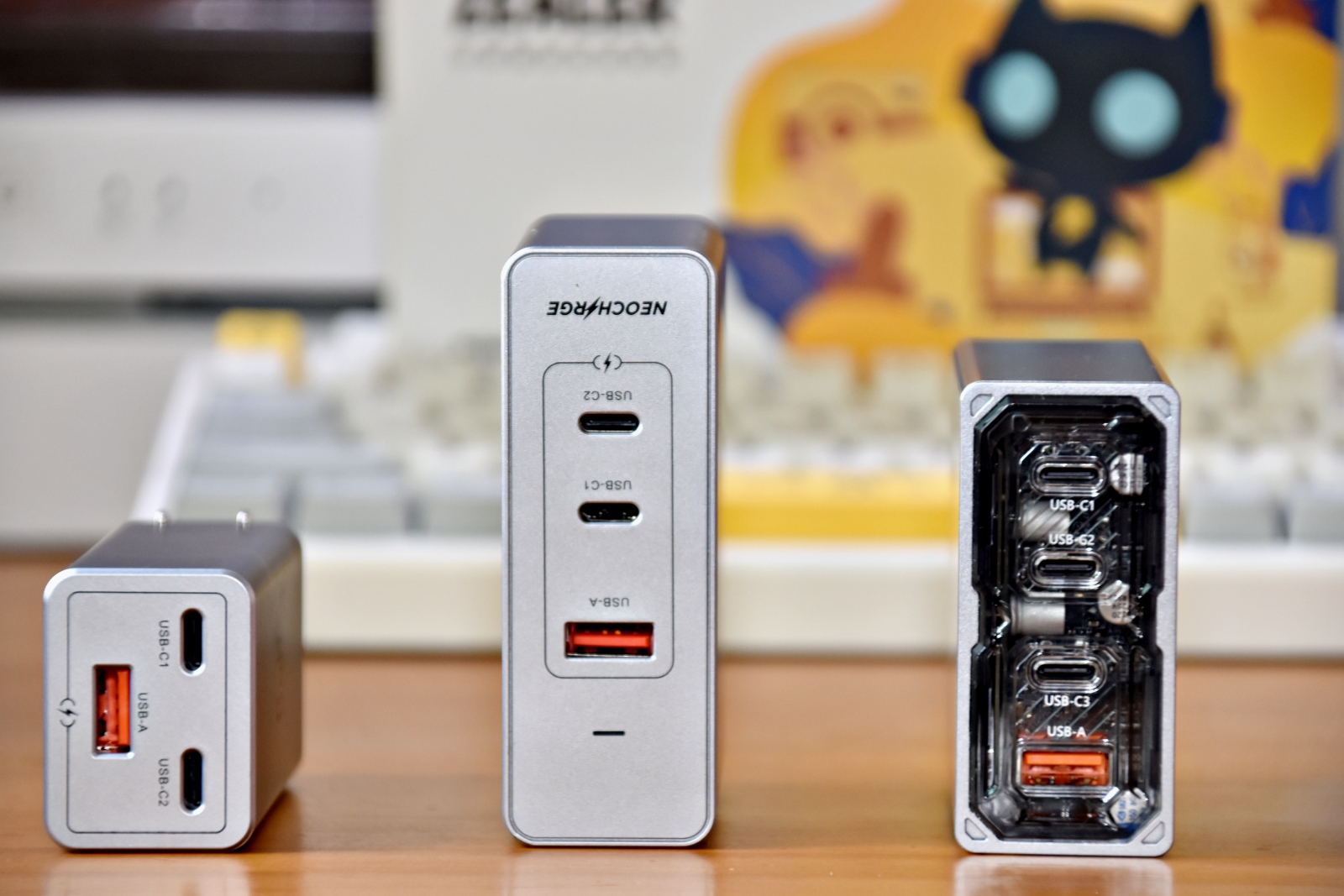 充电头设计了四个输出接口,三个 Type-C 接口,一个 USB-A 接口依次排列。就接口数量而言,这已是氮化镓充电头的顶配。如你所见,透明外壳是这款充电头的特色设计,透过外壳,能清晰地看见内部的元器件,呈现硬核科技美学,彰显另类个性。