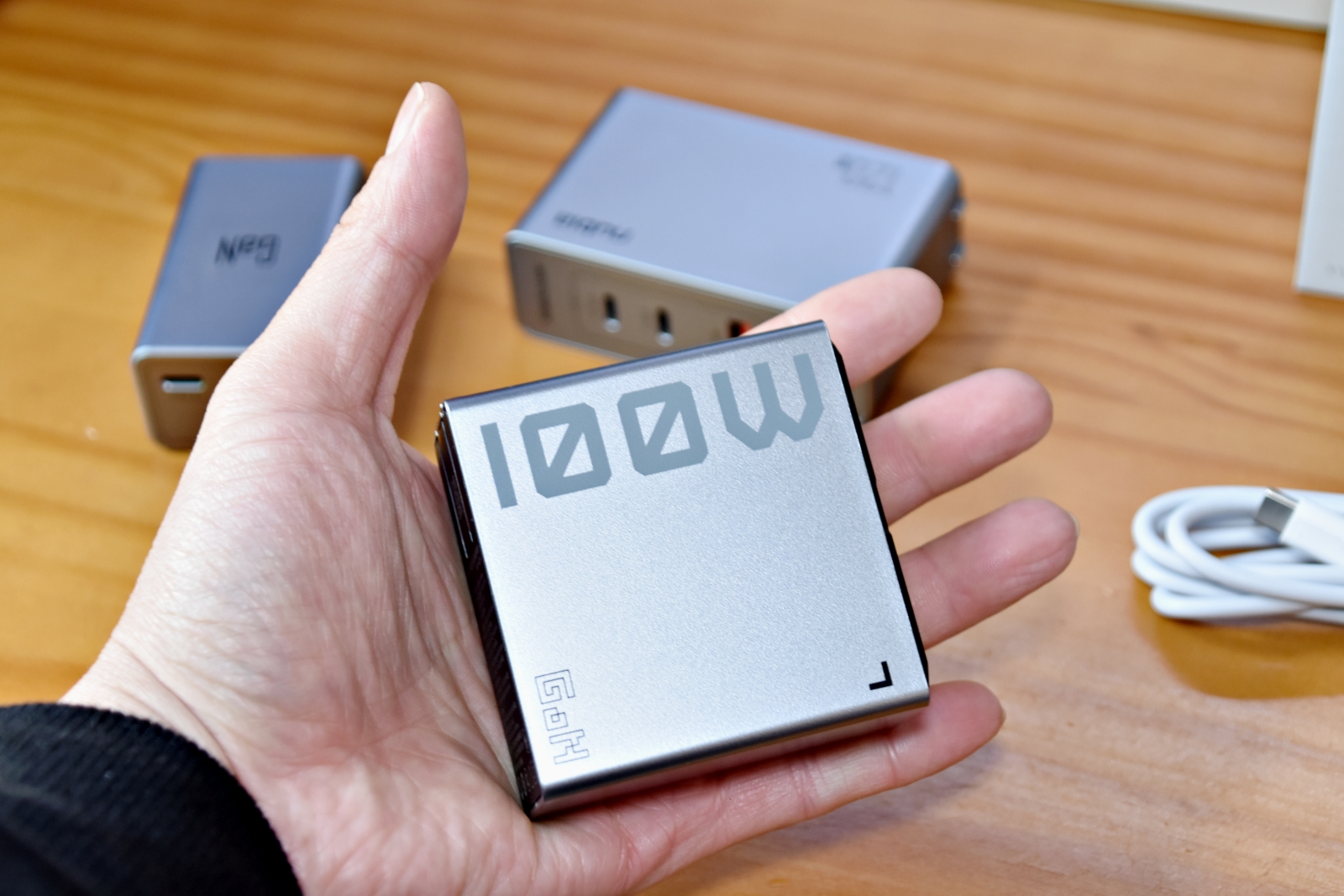充电头的尺寸是 68mm x 68mm x 31mm,重约 230g,像一个小正方体,大小正好能放在手掌里。