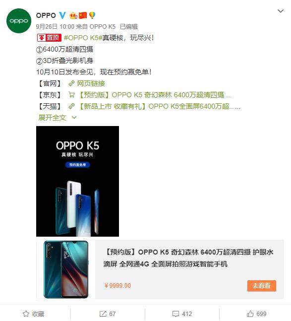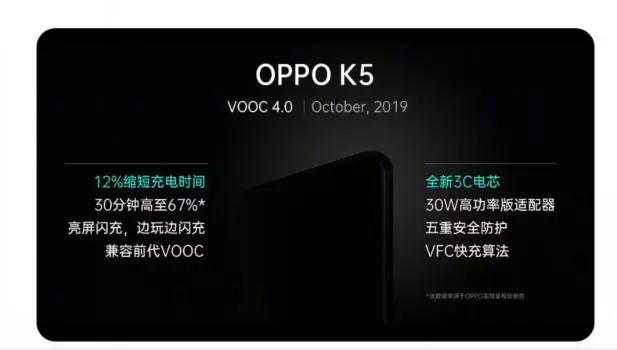 高端市场有OPPO Reno Ace坐镇,千元机市场中OPPO K5也表现得可圈可点。根据OPPO的官方爆料,OPPO K5将会搭载最新的VOOC 4.0闪充技术,能够在30分钟内将4000mAh电池电量充到67%,在80分钟内即可充满整个手机。