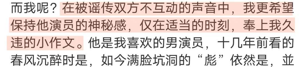 最值得一说的还是结尾,她回应了之前他俩互动变少、婚变不合的传闻,“我希望他能保持作为演员的神秘感,仅在恰当的时候,献上我的小作文。”夫妻又不是要24小时黏答答,我们都要保持彼此的边界,适时为对方送上喝彩即可。