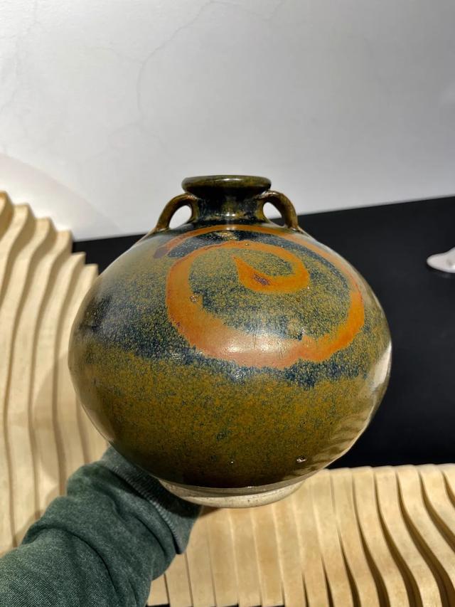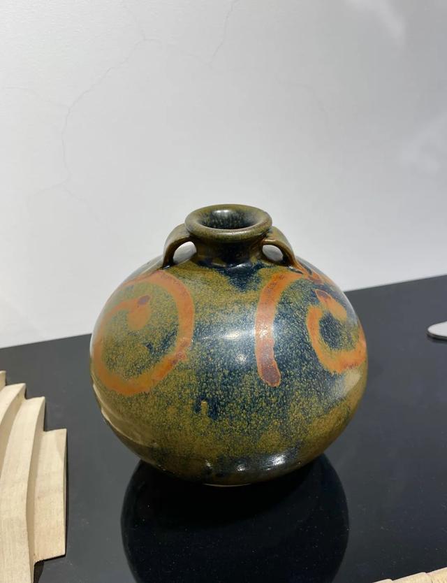 这件涡纹双系罐整体施黑釉,在黑釉基础上绘以漩涡纹饰,烧造中发生窑变,幽深釉色之上橘红色艳丽动人,对比冲击下的视觉效果,让观感更为丰富。