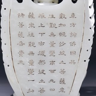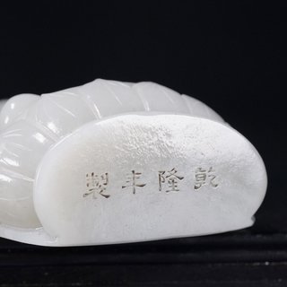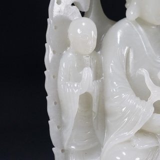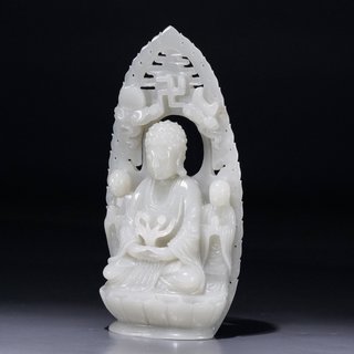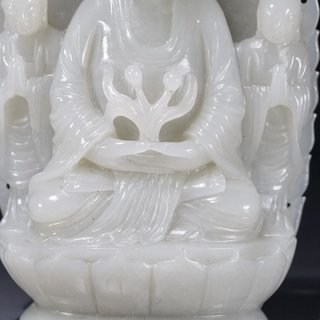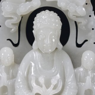 清乾隆,和田玉一佛二弟子摆件 高:16厘米.宽:8.2厘米.厚:3.8厘米.重:435克. 取材和田玉制,精雕释迦牟尼佛坐像。坐像头饰螺发,面态丰盈,慈悲肃穆,威严大气,形神兼备,呈全珈跌坐姿。两侧为其弟子摩诃迦叶与阿难陀,呈站姿,身后饰背光,背面雕刻诗文饰,整器材质上佳,莹润洁净,细致温润,富有光泽,色质匀一,触手舒适,实为难得。