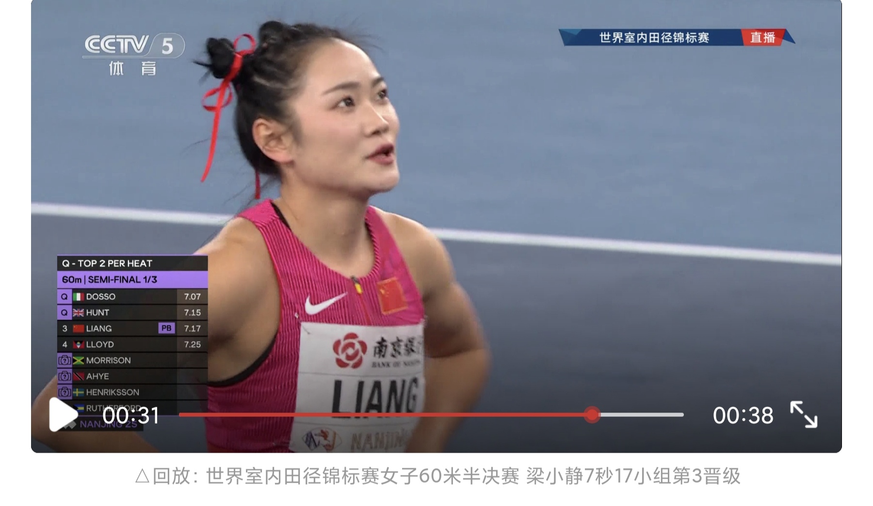 【短跑女将突破纪录】南京室内田径世锦赛见证中国速度新突破。梁小静在女子60米半决赛跑出7秒17,打破尘封多年的国家队赛会纪录。决赛中她再创7秒14个人最佳,虽然最终排名第八,但已创造中国选手在该项目的历史最佳战绩。这位广东姑娘赛后表示,这次突破给了她冲击更高目标的信心